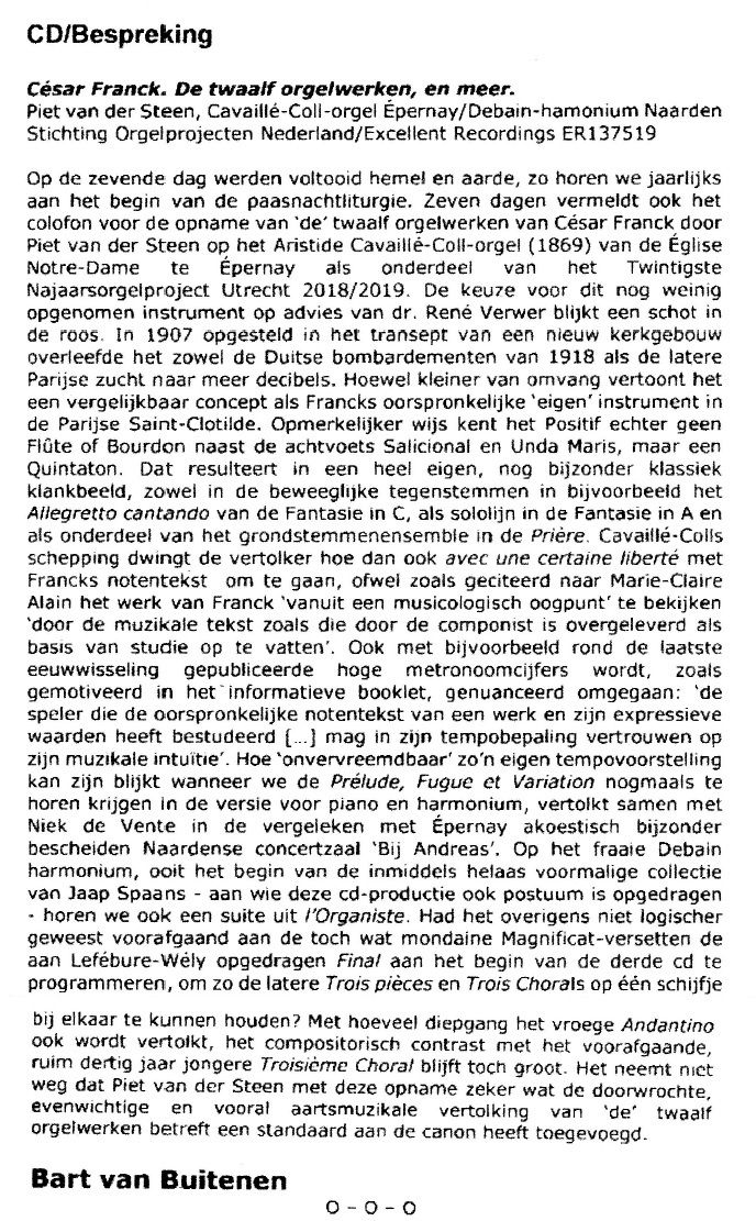 "Alleen al de kennismaking met dit schitterende instrument maakt de aanschaf van deze box de moeite waard.Bovenal is dat echter Van der Steens bevlogen spel, technisch gaaf en met alle begrip van de Frans-romantische orgelstijl."
